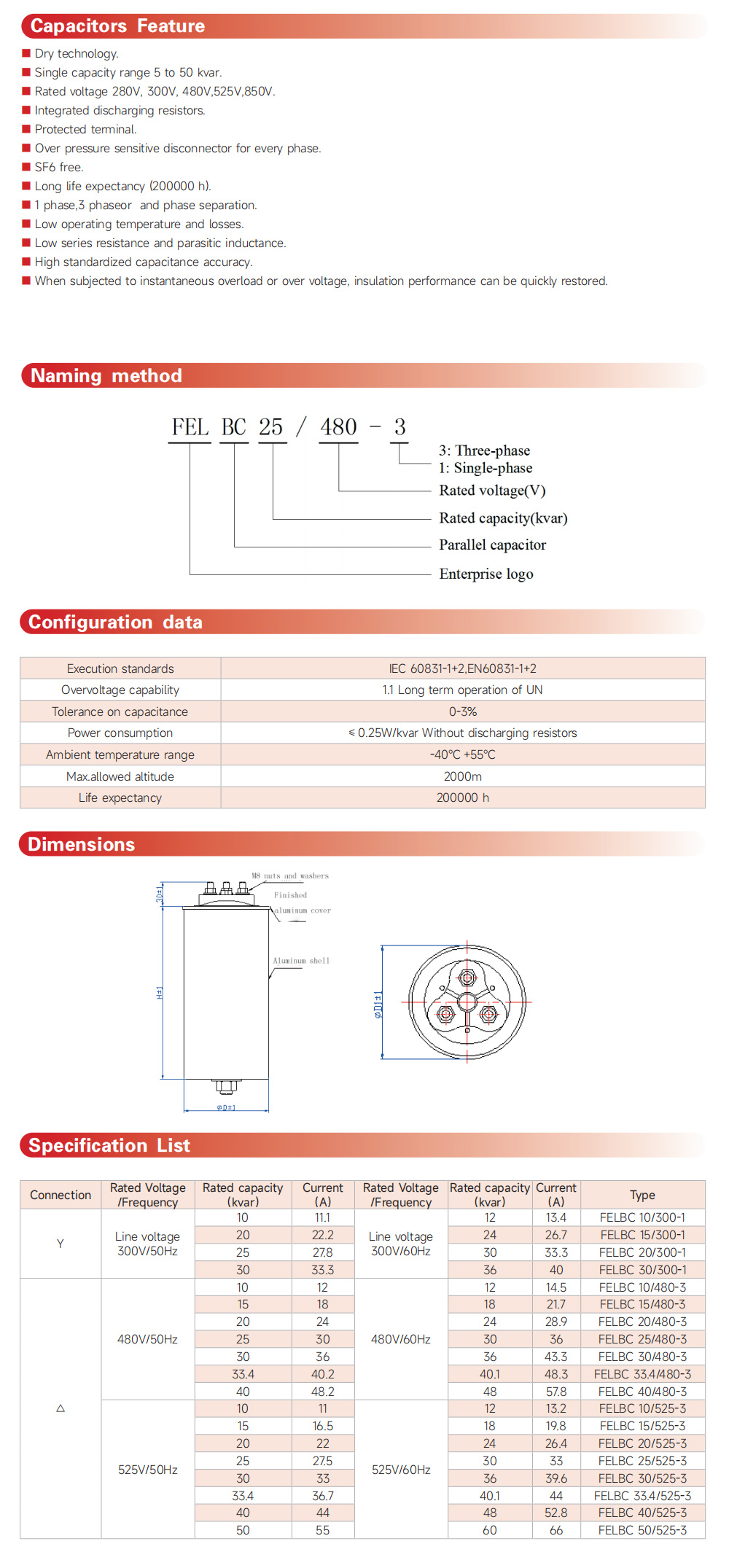 - FELBC is a reactive power compensation capacitor tailored for industrial enterprises and smart grids. FELBC capacitors are particularly suitable for applications with high harmonic content and low power factor. The use of a specially formulated polypropylene film layer as the dielectric effectively improves the working life and reduces losses of the capacitor. FELBC capacitors have dry self-healing technology, which enables them to withstand 2-4 times the overload capacity and extremely high peak current, with strong tolerance.