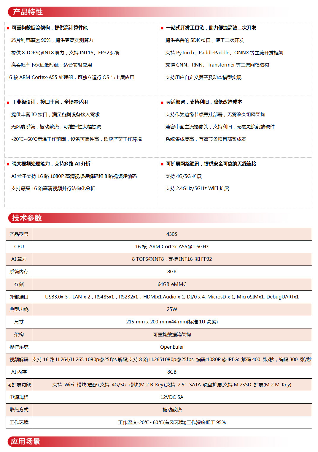 • 基于全球领先的CAISA数据流架构,搭载2x8核ARM Cortex-A55处理器,性能强劲,支持16路高清视频实时智能分析。星空N430S边缘小站扩展能力丰富、部署灵活,可广泛应用在智慧城市、智慧交通、智慧能源、智慧安监等领域。