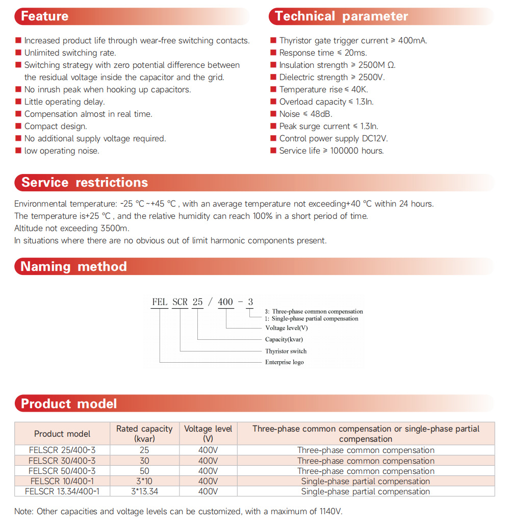 The FELSCR series thyristor switch is suitable for production scenarios with high harmonic current distortion rate or fast load current changes, replacing the use of capacitor specific switching contactors.