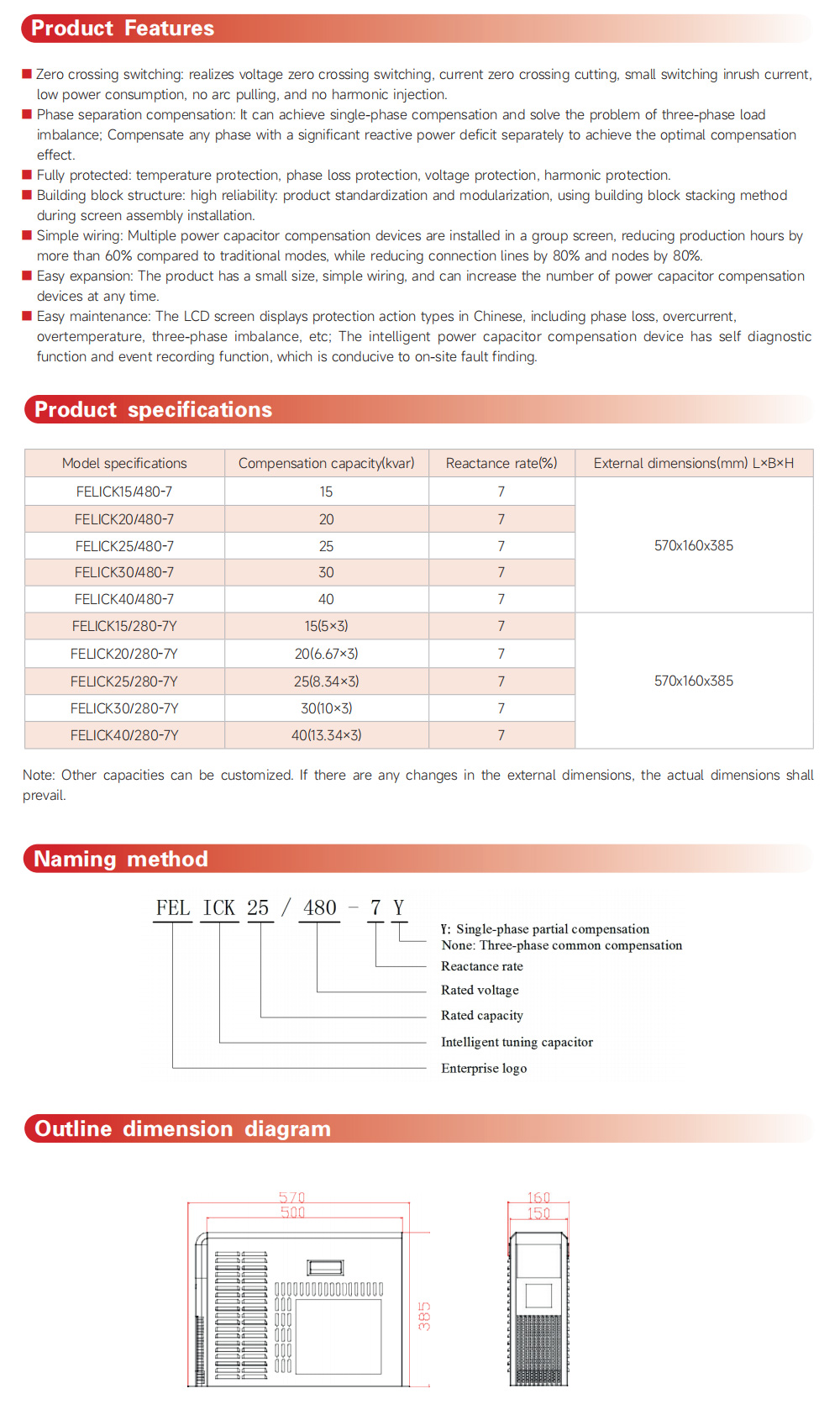 - The FELICK type tuned intelligent capacitor is a compensation unit that integrates measurement and control units, thyristor switches, filter reactors, compensation capacitors, and other devices into an integrated intelligent compensation unit. The overall modular design completely solves the problems of complex wiring, large size, and difficult maintenance of traditional reactive power compensation devices, and has better filtering and compensation effects,