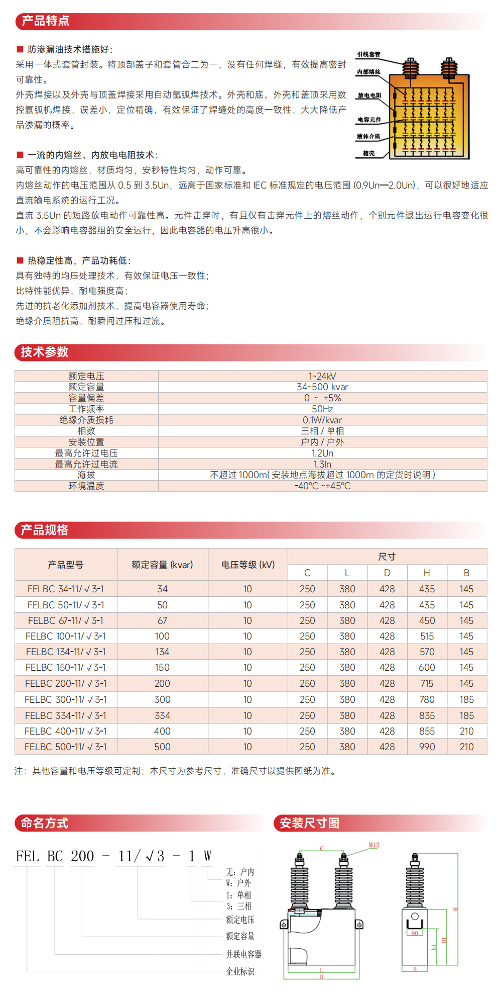 • FELBC 高压并联电容器主要应用于 1kV 以上供电系统,采用并联的方式接入电网,用来改善电网质量,提高系统功率因数,减少线路损耗,提高电网供电设备的效率。