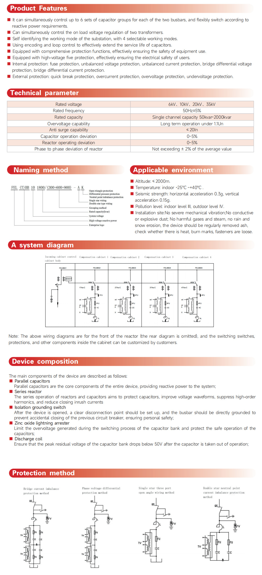 - The FELBB series high-voltage reactive power compensation complete set device is suitable for substation systems with voltage levels of 35kV and below. The device achieves automatic control of voltage and reactive power based on system voltage and reactive power demand, improves system power factor, enhances voltage quality, reduces line loss, and fully utilizes the efficiency of power generation and supply equipment.